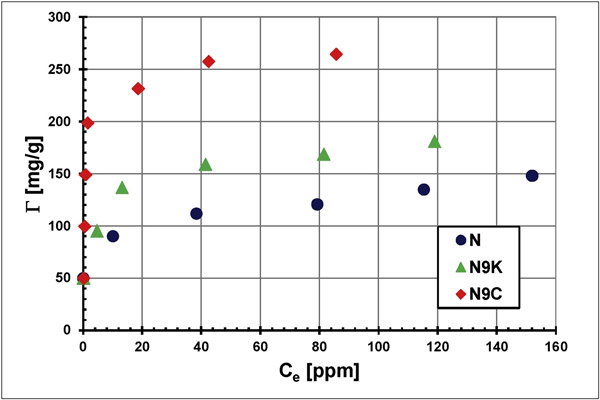 在圖3中比較了初始濃度為100 ppm的活性炭,N9K和N9C表面上初始濃度為100 ppm的聚合物溶液中PAA(Γ)的吸附量。?梢钥闯觯瑢(duì)于所有檢查的活性炭,觀察到隨著pH升高聚合物吸附明顯減少。這是由于所檢查系統(tǒng)中的靜電條件從有利的吸引條件(在較低的pH值)變?yōu)椴焕呐懦鈼l件(在較高的pH值)而引起的。而且,在更酸性的環(huán)境中,聚合物鏈的盤繞構(gòu)型使得吸附層的堆積更為緊密(高PAA吸附)。在較高的pH值下,PAA鏈發(fā)展的增加導(dǎo)致表面層中吸附的大分子的構(gòu)型更加延長(zhǎng),其特征是聚合物鏈段的堆積密度顯著降低(PAA吸附低)。