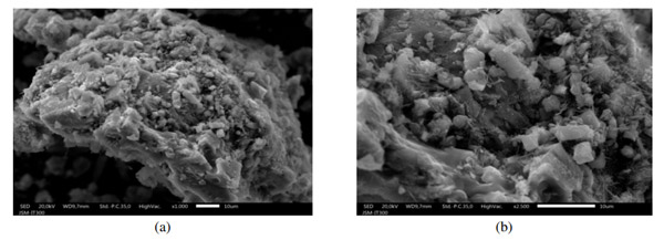 圖1:活性炭的SEM圖像,放大率(a)為1000x,(b)為2500x。