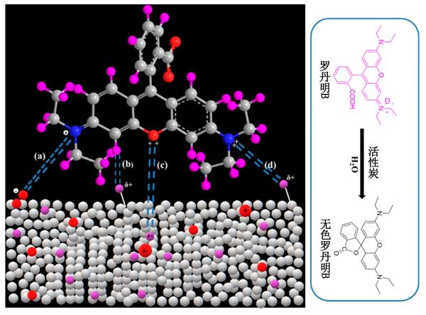 羅丹明B降解機理示意圖;钚蕴康谋砻嫔洗嬖趲讉官能團,它們可以與羅丹明B染料分子相互作用?赡艿南嗷プ饔煤喪鋈缦拢(a)活性炭的–COOH基團與羅丹明B的負電性基團之間的相互作用,(b)活性炭的–OH基團與羅丹明B的芳環(huán)之間的氫鍵,(c)氫鍵活性炭的–OH基團與羅丹明B的x噸基團之間存在(d)活性炭和羅丹明B染料分子的表面官能團之間的靜電相互作用。