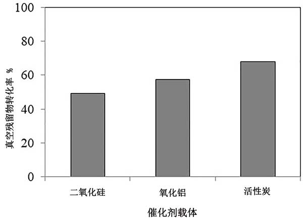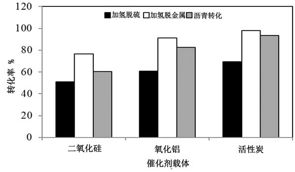 使用原油中的真空殘留物作為原料,在間歇反應(yīng)器中評估了加氫處理活性。因為所有反應(yīng)都是在幾乎相同的條件下進(jìn)行的,所以轉(zhuǎn)化率的差異主要歸因于所用催化劑的性質(zhì)。原料的性質(zhì)包含高瀝青質(zhì)(22%),硫(5.45%)和其它金屬含量。在圖2中,已經(jīng)提出了不同催化劑的加氫處理活性,使用活性炭,二氧化硅和氧化鋁為載體的催化劑獲得的加氫脫硫轉(zhuǎn)化率分別為70%,58%和61%。負(fù)載在氧化鋁上的催化劑具有高的加氫脫硫轉(zhuǎn)化率。