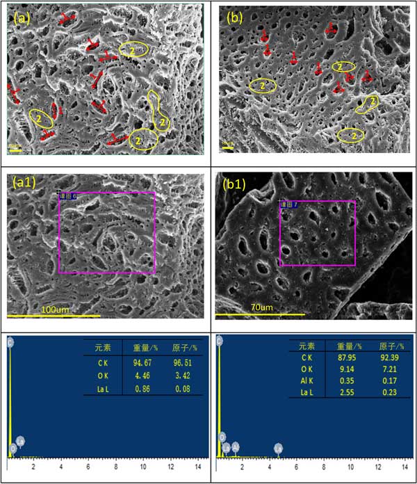 通過(guò)掃描電子顯微鏡(SEM)來(lái)顯示樣品的微觀形態(tài)和相應(yīng)的能量色散光譜(EDS)圖像,以證明鑭或鋁在兩種金屬上的成功加載的活性炭,在合適條件下制備。鑭改性活性炭和鑭鋁改性活性炭的SEM圖像如圖2所示。在圖2a中,有許多橢圓形孔標(biāo)記為1。鑭改性活性炭的表面較粗糙,而較細(xì)的多孔結(jié)構(gòu)則標(biāo)記為2。但是,鑭鋁改性活性炭的孔結(jié)構(gòu)在圖3b中進(jìn)行了更改。標(biāo)記為1的孔結(jié)構(gòu)變得更規(guī)則圓,標(biāo)記為2的細(xì)孔尺寸變大,并且孔分布更均勻,這適合更好的吸附能力。從圖2a1,a2和b1,b2中的樣品中檢測(cè)到元素鑭和鋁的存在。鑭的重量百分比為0.86%,經(jīng)過(guò)鑭(NO3)3·2H2O和率(NO3)3的改性后,明顯增加至2.55%。更多鑭的含量將顯示出更好的吸附性能,這可能是由于兩種元素在改性過(guò)程中的協(xié)同作用所致。