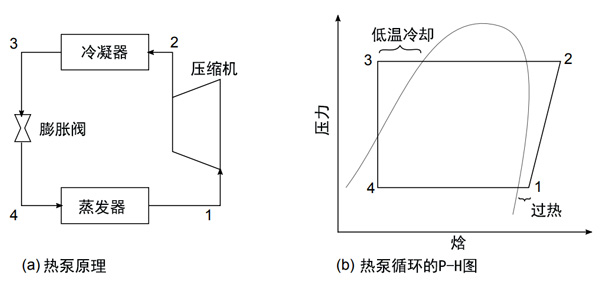 熱泵是空調(diào)的熱力學(xué)原理,可以基于狀態(tài)點(diǎn)的熱物理特性來預(yù)測熱泵的熱力學(xué)性能。圖2(a)顯示了典型熱泵的示意圖,圖2(b)顯示了壓力-焓線圖上的熱泵循環(huán)。在我們的模擬中,不僅計(jì)算了每種狀態(tài)下的熱物理性質(zhì),而且還計(jì)算了蒸發(fā)器和冷凝器中的熱交換過程。由于換熱器規(guī)格的可用性限制,所以將換熱器建模為雙管逆流式換熱器,該換熱器用于我們的實(shí)驗(yàn)裝置中。