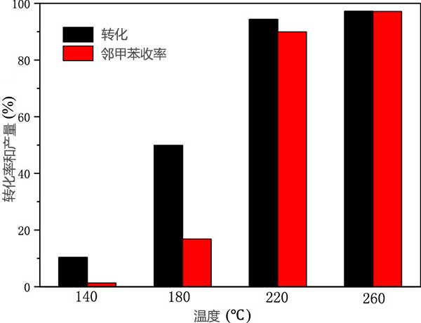 為了評價制備的磷化鎳活性炭的有用性,進行對生物油模型化合物加氫脫氧的活性。在測試中,我們使用SA(水楊醛)作為熱解油的代表性組分來探索加氫脫氧途徑。在這項工作中,SA轉(zhuǎn)化為鄰甲酚可以通過路徑氫化/氫解或C=O鍵的直接氫解進行。圖2顯示了加氫脫氧相對于鎳的轉(zhuǎn)化率和產(chǎn)率活性炭受反應(yīng)溫度影響。結(jié)果表明,隨著反應(yīng)溫度的升高,SA的轉(zhuǎn)化率和鄰甲酚的收率逐漸增加。當(dāng)反應(yīng)溫度為260℃時,鄰甲酚目標(biāo)產(chǎn)物的產(chǎn)率較大,2小時達(dá)到97.1%,這表明反應(yīng)溫度顯著提高了它的區(qū)域選擇性加氫脫氧的催化活性。