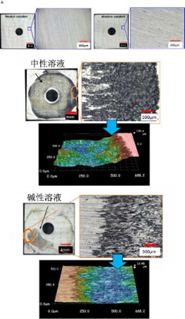 使用光學(xué)顯微鏡觀察實(shí)驗(yàn)后樣品的表面形態(tài),如圖3所示。在中性和堿性溶液中未與活性炭接觸的樣品中未觀察到縫隙腐蝕。另一方面,在中性和堿性測(cè)試溶液中與活性炭接觸的樣品上發(fā)生縫隙腐蝕。這些結(jié)果清楚地表明,當(dāng)樣品與活性炭接觸時(shí),縫隙腐蝕敏感性增加。在中性測(cè)試溶液的情況下,最大腐蝕深度為130μm并且縫隙腐蝕傳播以覆蓋樣品的幾乎所有褶皺區(qū)域。在堿性測(cè)試溶液的情況下,最大腐蝕深度為25μm并且腐蝕區(qū)域遠(yuǎn)小于中性溶液的情況。這些結(jié)果表明,在中性溶液的情況下腐蝕區(qū)域和深度更大,這表明在吸附塔中發(fā)生實(shí)際腐蝕。在堿性溶液的情況下腐蝕面積和深度較小的原因被認(rèn)為是Fe(OH)2的溶解速率的事實(shí)堿性溶液減少,這導(dǎo)致腐蝕速率降低。基本上,在陽(yáng)極部位的pH降低至去鈍化pH是縫隙腐蝕開始和傳播所必需的?紤]到這個(gè)方面,還可以解釋縫隙腐蝕行為的差異。