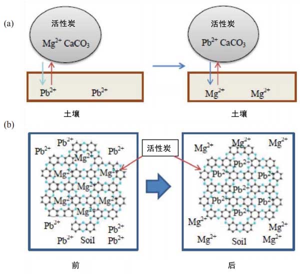 圖3:(a)活性炭中的Mg2+與土壤中Pb2+的離子交換過(guò)程和(b)鉛污染土壤中的離子交換。