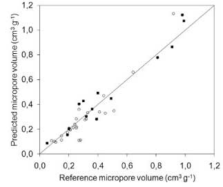 由于微孔由于其尺寸而優(yōu)先被碘分子存取,所以碘值也通過最小二乘回歸與微孔體積直接相關(guān)。然而,所獲得的誤差要高于考慮亞甲藍和碘值時的誤差。這表明亞甲藍在微孔體積預(yù)測中有一定貢獻,可能是由于在較大微孔中的吸附。
