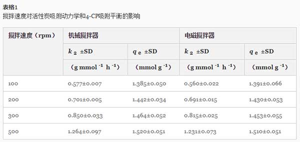 表1中的數(shù)據(jù) 也表明,攪拌速率不僅影響吸附動(dòng)力學(xué),而且影響4-CP從水中的去除效率。吸附容量從1.385增加到1.520 mmol·g -1(機(jī)械攪拌器)和從1.391增加到1.510 mmol·g -1(磁力攪拌器),攪拌速度從100增加到500rpm。觀察到從20.06 4-CP的吸附容量的增加至23.04毫克克-1攪拌速度從300到600轉(zhuǎn)。然而,一些作者已報(bào)道,用增加攪拌速度只能達(dá)到一定的限度,超過(guò)此有在吸附容量無(wú)顯著增加吸附增加。在一些情況下,觀察到在更高的攪拌速率在吸附容量的降低。正如作者所提出的,這是由于這樣一個(gè)事實(shí),即在非常高的攪拌速度下,吸附分子和吸附劑顆粒的動(dòng)能增加到足以使它們相互碰撞而導(dǎo)致分離松散結(jié)合的吸附分子。