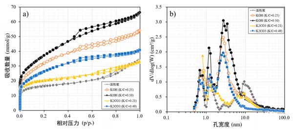 圖2:(a)氮等溫線和(b)通過(guò)用氫氧化鉀和碳酸鉀以不同鉀/炭比浸漬制備的活性炭的孔徑分布。