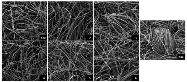 活性炭材料的結(jié)構(gòu)特性,包括編織類型、厚度、密度、BET表面積和微孔率。非織造纖維型比織造活性炭型厚2至4.5倍,但密度不如活性炭,使毛氈型具有海綿狀外貌;钚蕴坷w維材料的BET表面積都很大,微孔面積也比較大。平均微孔面積百分比范圍為83.9%至93.2%,平均孔徑范圍為1.59至1.70nm(<2nm),表明活性炭材料主要是微孔的。BET表面積與微孔面積(r=0.997)呈強正相關(guān),但與微孔面積百分比(r=-0.982)呈強負(fù)相關(guān);钚蕴坎牧现欣w維的組織顯示在SEM圖像中200倍放大倍數(shù)下,毛氈型顯示隨機排列的松散無紡纖維,而布料型顯示緊密編織的纖維,外觀更致密(圖1)。