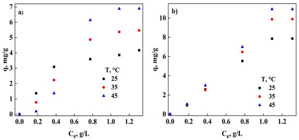 平衡吸附分析使我們能夠獲得不同等溫線模型的參數(shù),表明在去除污染物時(shí)進(jìn)行了何種類型的過程。在圖1中,顯示了使用粉末活性炭(圖1a)和活性炭(圖1b)在不同溫度下DNS的吸附能力。還觀察到3,5-二硝基水楊酸在兩種吸附劑中的吸附都隨著溫度的升高而顯著影響,隨著溫度的升高呈現(xiàn)出更大的吸附。因此,在45℃時(shí),活性炭和粉末活性炭的大吸附容量分別為6.97和11.57mg/g。這可能是由于去除過程的環(huán)境,這會(huì)導(dǎo)致吸附劑表面隨著溫度的升高而增加其對(duì)3,5-二硝基水楊酸吸附的參與。使用商用活性炭的文獻(xiàn)中也報(bào)道了類似的行為。在其他研究中,使用這種吸附劑還觀察到,基于苯酚、高氯酸鹽和重金屬等的不同化合物的吸附能力有所增加。
