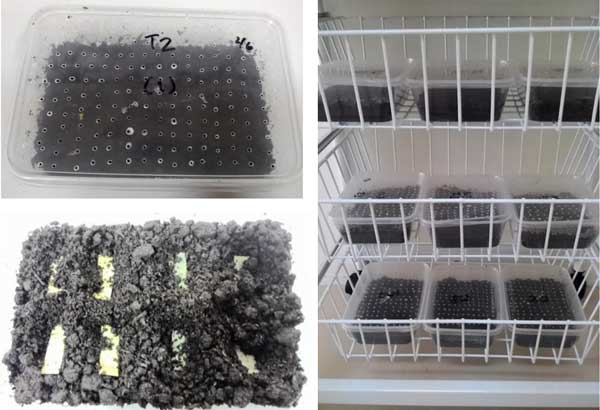 含活性炭和不含活性炭的纖維紙被切成3厘米x1厘米的條。這些紙在75℃下干燥48小時,干燥后的重量計算為初始干重。將紙張放入裝有堆肥土壤的塑料容器中,該土壤由農(nóng)業(yè)產(chǎn)業(yè)生產(chǎn)的堆肥生活垃圾制成,濕度為45%,并用多孔蓋子蓋住。試驗組由12次重復(fù)組成,觀察12周,間隔4周(3次采樣)。采樣時間表示為T1、T2和T3。初始條件表示為T0。在取樣時,取出紙片并用軟刷清潔。土壤中生物降解試驗的描述如圖1所示。