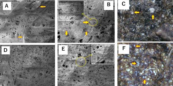 圖3:紙表面的顯微外觀(50倍放大),(A)在生物降解測試前帶有納米活性炭/纖維素紙;(BC)經(jīng)生物降解試驗后的納米活性炭/纖維素紙;(D)纖維素紙僅在生物降解試驗之前;(EF)纖維素紙僅經(jīng)過生物降解測試。黃色狹窄對應(yīng)于來自土壤的真菌菌絲體,插入的圖像放大250倍。