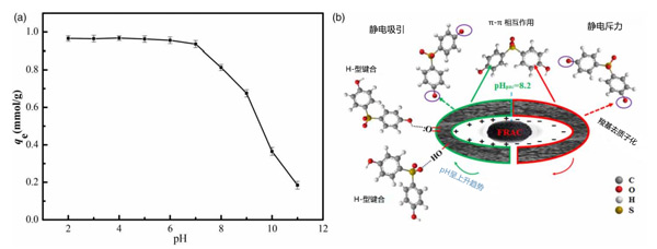圖4:(a)pH值對(duì)活性炭吸附雙酚S容量的影響,(b)雙酚S在活性炭上的吸附機(jī)制。