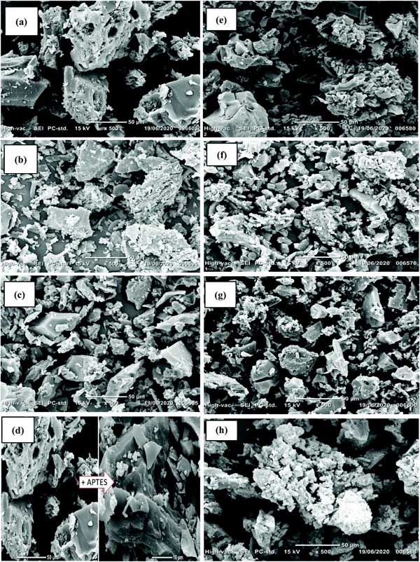 材料的SEM圖像在圖1中給出;钚蕴烤哂胁痪鶆虻墓饣砻,粒徑約為50μm(圖1a)。在用硝酸和過氧化氫進(jìn)行氧化處理后,氧物質(zhì)(羧基和硝酸鹽基團(tuán))被接枝,導(dǎo)致活性炭-OH的表面比活性炭更粗糙(圖1e)。通過APTES處理接枝氨基硅烷是成功的:活性炭-APTES和活性炭-OH-APTES表面分別比活性炭和活性炭-OH更光滑(圖1d和f)。裂縫和不均勻的空腔可用作氟化物的吸附位點(diǎn)。存在的粗糙表面和大量白色顆粒證實(shí)了Al顆粒的添加(圖2c、g和h)。這些白色顆?梢詫(yīng)于結(jié)合到材料表面的不同形狀和尺寸的Al納米顆粒的不同簇。