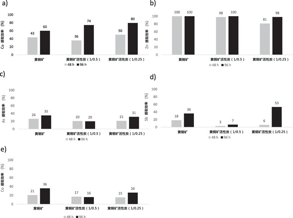 使用帶有攪拌的恒溫浴用于浸出測試,該測試在90℃和250rpm下在250mL硼硅酸鹽玻璃罐中使用H2SO4溶液(在pH值1)濃度為5gL-1的Fe(III)。在浸出過程中控制溫度(90℃)和攪拌速度(250rpm),直到48和96小時。浸出劑溶液的Eh為547mV。硫酸的純度和硫酸鐵(III)分別為97%和99.5%。在每個實驗中,在硼硅酸鹽玻璃罐中稱量2.5g。除對照外,活性炭比為1/0.5和1/0.25。然后,加入50mL浸出劑。使用兩個反應(yīng)時間對每種活性炭混合物進(jìn)行兩次浸出實驗:第一次直到48小時,第二次直到96小時。在浸出實驗期間,每24小時打開一次罐子,以確保浸出系統(tǒng)有足夠的氧合。在反應(yīng)結(jié)束時(48小時和96小時),將紙漿過濾并用50mL/H2SO4洗滌兩次pH2的溶液以回收吸附在活性炭表面上的金屬。通過測定浸出和洗滌溶液中的Cu、Zn、As、Co和Sb的含量。