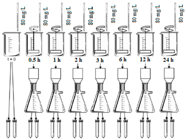 測定平衡時間的吸附試驗對每種活性炭進行兩次。使用了7個裝有500mL研究水的1L燒杯。每個燒杯接受一份活性炭懸浮液,以在水研究中獲得80mg/L的初始濃度。將燒杯放在一個罐子測試設備中,將混合速度保持在205rpm在恒溫23℃的環(huán)境中。采用的接觸時間為0.5、1、2、3、6、12和24小時。接觸時間后,將每個燒杯從攪拌中取出,立即通過孔徑為0.22μm的纖維素酯膜過濾研究水,以分離碳并中斷吸附過程。分析過濾后的水餾分的pH值和柱狀藻紅濃度。圖1顯示了平衡時間測定分析中評估的條件的示意圖。