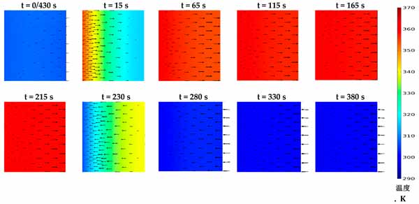 活性炭復(fù)合吸附劑的壓力和溫度決定了平衡吸收,它代表了在給定時間分別在吸附和解吸階段可以達到的最大和最小吸收容量。然而,顆粒內(nèi)和顆粒間的傳質(zhì)阻力表明吸附材料在每種給定情況下可以多快達到其平衡吸收能力。這突出了在本研究中同時求解兩種傳質(zhì)機制與其他控制方程的重要性,以顯示促進傳熱對傳質(zhì)的凈效應(yīng)。圖2顯示了在430秒循環(huán)時間內(nèi),考慮到預(yù)熱和預(yù)冷階段均為30秒的時間間隔內(nèi)代表性部分的固結(jié)吸附劑域的溫度分布。