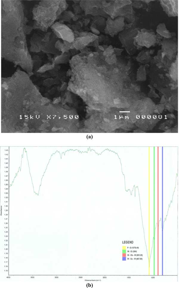 圖1:活性炭負(fù)載的磷鎢酸(a)x7500放大倍數(shù)的掃描電子顯微鏡圖像和(b)FTIR光譜。