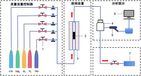 圖2:氣體反應(yīng)裝置示意圖(1)轉(zhuǎn)子流量計(jì),(2)催化劑,(3)固定床反應(yīng)器,(4)緩沖氣瓶,(5)探測(cè)槍,(6)煙氣分析儀,(7)廢氣回收裝置。