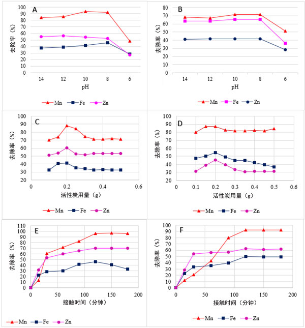 在分批吸附研究中,pH值是一個(gè)重要因素,它會通過改變所用吸附劑的表面電荷分布來影響吸附過程。在6和14的范圍內(nèi)觀察到木材加工廢水中重金屬(Mn、Fe和Zn)的pH相關(guān)影響。圖3A、B清楚地表明,當(dāng)纖維板加工廢水中的Mn、Fe和Zn分別使用pH8時(shí),兩種活性炭均獲得最佳結(jié)果。