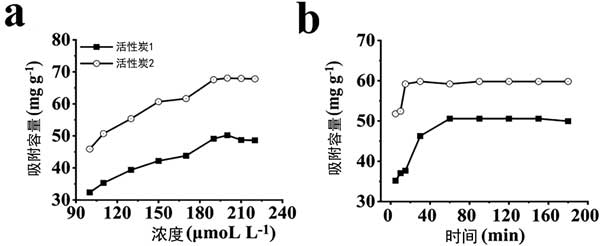 圖1:兩種活性炭對(duì)銅離子的(a)等溫吸附和(b)動(dòng)態(tài)吸附。