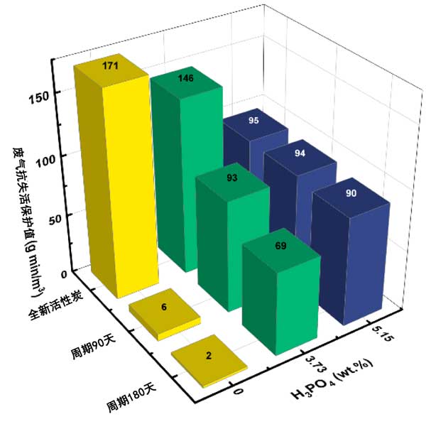 在實(shí)驗(yàn)條件下活性炭加速失活3個(gè)月和6個(gè)月,對(duì)比常態(tài)下的改性活性炭對(duì)抗廢氣的效果分別降低了59-89%和>75%。磷酸鹽的添加抑制了活性炭的失活,失活3-6個(gè)月后防護(hù)值僅下降17~23%和32~37%。一般來(lái)說(shuō),與正常情況相比,保護(hù)后的活性炭可以提高吸附時(shí)長(zhǎng)。其原因是失活后,特別是在沒(méi)有添加劑的活性炭中,浸漬金屬的化學(xué)吸附能力非常低。因此,廢氣的吸附主要通過(guò)物理吸附發(fā)生。干燥去除了占據(jù)物理吸附位點(diǎn)的水,從而能夠通過(guò)物理吸附吸附一定量的廢氣。實(shí)際上,即使活性炭失活并超過(guò)其預(yù)期保質(zhì)期,其保護(hù)能力也可能通過(guò)干燥而部分恢復(fù)。