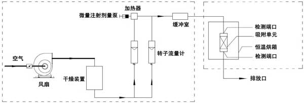動(dòng)態(tài)吸附實(shí)驗(yàn)在室溫(25℃)下進(jìn)行。實(shí)驗(yàn)裝置由氣體分配系統(tǒng)和吸附系統(tǒng)兩部分組成。吸附系統(tǒng)由恒溫箱和吸附單元組成。檢測(cè)口位于吸附系統(tǒng)之前和之后。動(dòng)態(tài)法測(cè)定活性炭對(duì)脈沖負(fù)荷緩沖性能的裝置如圖1所示。本實(shí)驗(yàn)以乙醇或二甲苯為單一檢測(cè)對(duì)象。氣體分配系統(tǒng)包括風(fēng)扇、干燥裝置、轉(zhuǎn)子流量計(jì)、微注射計(jì)量泵、加熱器和緩沖室。使用FT-IR傅里葉氣體分析儀作為測(cè)量設(shè)備。在氣體分配系統(tǒng)中,在短時(shí)間內(nèi)(2分鐘和5分鐘),微注射計(jì)量泵的注射量迅速增加到原始體積的預(yù)定倍數(shù)(10倍和20倍),以產(chǎn)生脈沖負(fù)載。在吸附系統(tǒng)中,吸附單元內(nèi)放置活性炭。吸附單元的直徑為31mm。活性炭的填充高度分別為2cm、4cm、6cm、8cm。將吸附裝置置于恒溫箱內(nèi)。吸附劑和吸附物的入口空氣保持在室溫。進(jìn)行了吸附劑在室溫下吸附吸附質(zhì)的脈沖加載實(shí)驗(yàn)。潔凈空氣通過(guò)干燥裝置后,利用轉(zhuǎn)子流量計(jì)將其按特定比例分成兩個(gè)通道。通過(guò)微注射泵將特定濃度的乙醇或二甲苯氣體注射到氣體中。另一種氣體用作稀釋氣體。兩種氣體流入緩沖室,完全混合后進(jìn)入恒溫箱。穩(wěn)定的氣體按照實(shí)驗(yàn)設(shè)定的濃度、流量和溫度進(jìn)入吸附單元。在通過(guò)吸附單元之前和之后測(cè)量乙醇或二甲苯的濃度。