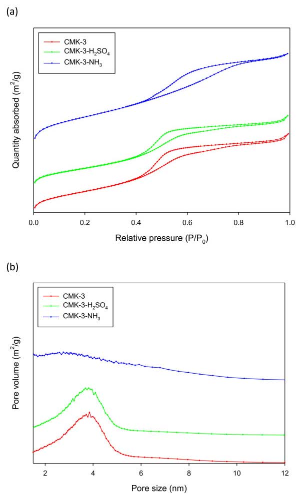 表1列出了本研究中使用的活性炭的物理性質(zhì)。活性炭-3的比表面積為1178m 2 / g。經(jīng)硫酸處理后比表面積略有下降至1,002m 2 / g,經(jīng)氨處理后比表面積大幅度上升至1663m 2 / g。圖2示出了氮?dú)馕降葴鼐和孔碳的孔隙大小分布。圖2a示出了用于活性炭-3,活性炭-3-H的氮吸附等溫線2 SO 4,和活性炭-3-NH 3。所有樣品在0.5 的相對(duì)壓力(P / P 0)下都顯示典型的介孔材料的IV型等溫線。表表11表明,CMK-3具有的3.8納米的孔徑中孔。用硫酸處理后維持這些中孔。當(dāng)活性炭-3用氨處理時(shí),平均孔徑減小到3.1nm。氨處理是高溫(900℃)工藝,其產(chǎn)生微孔,引起表面積的大量增加和平均孔徑的減小。另一方面,大部分介孔活性炭-3在氨處理后保持。