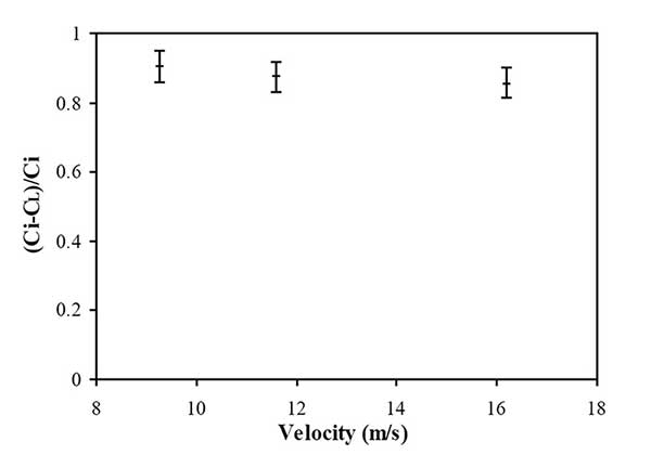 流速同時(shí)影響氣體吸附和活性炭回收,因?yàn)樗婕皻怏w和活性炭顆粒的混合程度、。圖3在各種活性炭吸附劑尺寸下,氣體去除效率和流量之間呈現(xiàn)出輕微的反比關(guān)系。最小的吸附劑(活性炭-1)以9.26米/秒除去77.4%的甲苯蒸氣,然后以16.2米/秒降至65.4%。微粒活性炭吸附劑捕獲沿著旋風(fēng)分離器的流動(dòng)路徑行進(jìn)的甲苯蒸氣。雖然在前面的的內(nèi)容說(shuō)過(guò)吸附量以高速增加,但是氣體去除效率相當(dāng)?shù)汀_@是因?yàn)樵诟吡髁肯录妆降慕^對(duì)體積要高得多。因此,即使活性炭吸附得更多,更多的氣體分子傾向于流出而沒(méi)有在內(nèi)部吸收。因此,關(guān)于顆;厥蘸蜌怏w去除效率的最佳流量必須通過(guò)在各種操作條件下的眾多實(shí)驗(yàn)來(lái)確定。