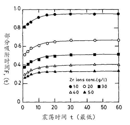 圖2.不同鋯離子濃度下活性炭對(duì)搖動(dòng)時(shí)間的鋯離子吸附。