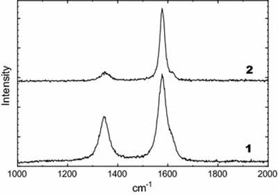 圖1:活性炭的拉曼光譜:1、活性炭-A,2、活性炭-B。