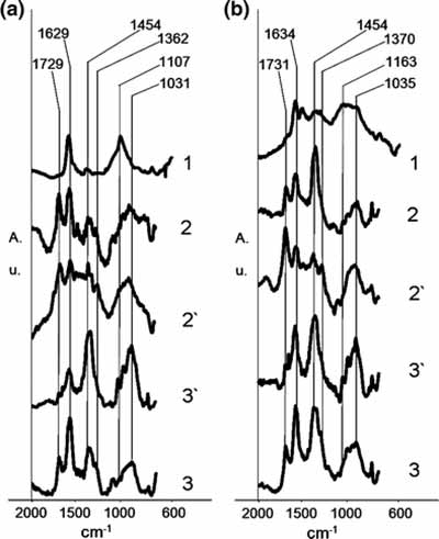 圖2:活性炭-A(a)和活性炭-B(b)的FTIR光譜:初始(1),吸附(2-3)和電化學(xué)環(huán)化(2',3')從含有4-氯苯氧基乙酸的電解質(zhì)溶液。