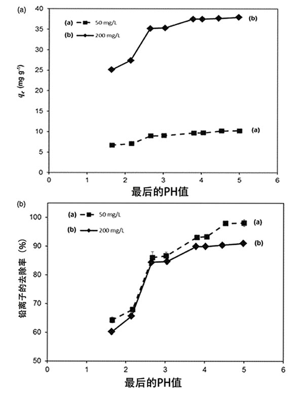 圖3.pH對活性炭明膠復(fù)合材料對鉛離子吸附的影響;钚蕴棵髂z復(fù)合材料劑量0.15g/50ml,溫度23±2℃,鉛濃度(a)50mgl-1和(b)200mgl-1。