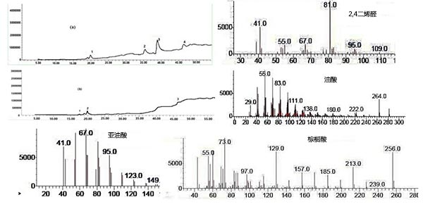 所有顏色指數(shù)(a,b,L)都受吸附過(guò)程的影響。廢油脂的紅色(a*)為9.3,吸附后達(dá)到1.3,廢油脂的黃(b*)在吸附前后分別為9和1.5。明度(L*)在吸附前58,處理后達(dá)到61。此外,活性炭不僅能對(duì)廢油進(jìn)行脫色處理,還可以進(jìn)行成品柴油的脫色,使得產(chǎn)品從外觀變得更好看。在未經(jīng)處理的廢油中,2,4二烯醛,棕櫚酸,亞油酸和油酸是廢油中的主要成分。 在經(jīng)處理的廢油的情況下,被識(shí)別的主要成分包括2,4-癸二烯酸和油酸。如圖2所示,棕櫚酸和亞油酸的峰在處理過(guò)的廢油中完全消失。2,4-十二烯醛也減少(15.3%)。這些結(jié)果表明吸附對(duì)減少?gòu)U油中的雜質(zhì)具有相當(dāng)大的影響。在脂質(zhì)氧化過(guò)程中,氫過(guò)氧化物形成并分解,并且這樣做,產(chǎn)生二次氧化產(chǎn)物,如醛和酮。在兩種條件下(吸附過(guò)程之前和之后)在廢油中檢測(cè)到2,4個(gè)十二烯醛,但在處理過(guò)的廢物中觀察到減少量為15.3%