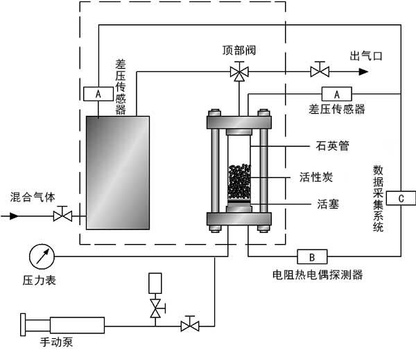 實(shí)驗(yàn)材料使用氫氣(99.99%)和二氧化碳(99.99%)。在實(shí)驗(yàn)室中制備兩種不同比例的氣體混合物作為原料氣。通過(guò)兩步分離過(guò)程觀察不同比例的混合氣體和活性炭分離性能的分離性能差異。通過(guò)氣相色譜儀分析進(jìn)料氣體和平衡氣體的組成。在實(shí)驗(yàn)之前,將活性炭樣品在100℃的真空干燥箱中干燥至恒重。
