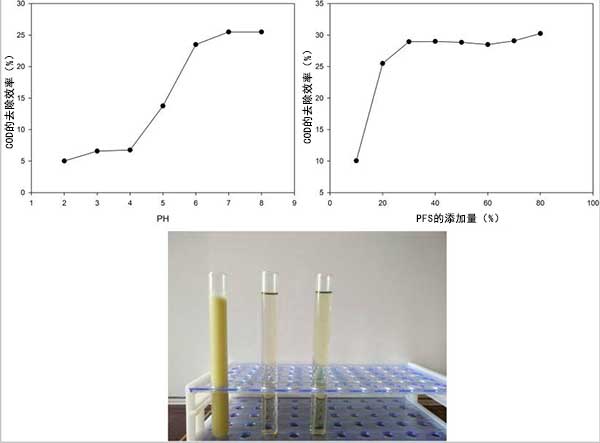 在活性炭負(fù)載鐵離子的初級(jí)絮凝預(yù)處理后,濾液含有少量雜質(zhì)。研究了PFS絮凝劑對(duì)過(guò)濾廢物的影響。使用單因素實(shí)驗(yàn)選擇pH值和PFS添加量(圖3a,b)。原始溶液與初級(jí)和次級(jí)絮凝后的溶液的視覺(jué)比較顯示在圖3c中。