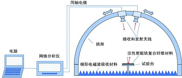 采用拱形法研究了電磁波吸收性能。測試裝置在圖1中示意性地示出。矢量網(wǎng)絡(luò)分析儀與接收和發(fā)射天線相連,其中一個具有增強和發(fā)射頻率電磁波的功能,另一個具有接收反射信號的功能。根據(jù)反饋信號強度,活性炭載鐵復(fù)合纖維材料的尺寸為180×180mm,厚度為2mm。