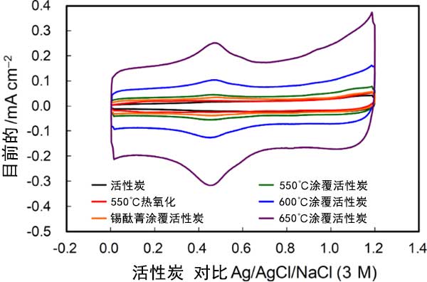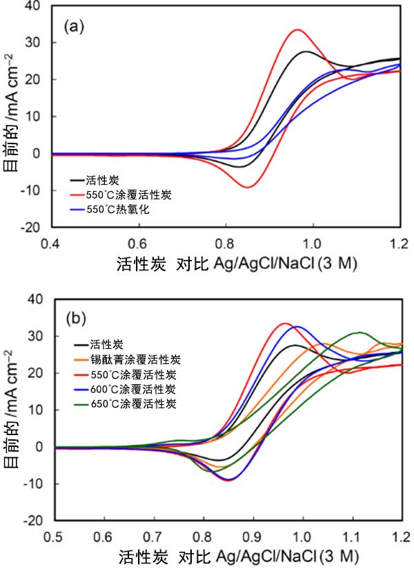 在沒有釩離子的酸性電解質(zhì)中獲得的循環(huán)伏安圖顯示在圖3中。伏安圖中的電流由三個組分組成,即活性炭-電解質(zhì)界面處的電化學(xué)雙層充電電流,以及由于表面官能團(tuán)的氧化還原反應(yīng)和活性炭表面氧化引起的法拉第電流。電化學(xué)雙層充電產(chǎn)生恒定電流和矩形CV形狀。電流取決于基面和邊緣平面的曝光程度,在0.5V附近的寬氧化還原峰和0.8V以上的氧化電流分別歸因于醌/氫醌樣表面官能團(tuán)的氧化還原反應(yīng)和活性炭表面氧化。這些電流在熱氧化后增加,并且在錫酞菁涂覆活性炭的熱氧化期間隨著溫度的升高而增加。電化學(xué)雙層電流的增加歸因于邊緣平面的暴露,這與拉曼光譜一致。對于錫酞菁涂覆活性炭觀察到的活性炭表面氧化電流意味著高表面粗糙度的發(fā)展。