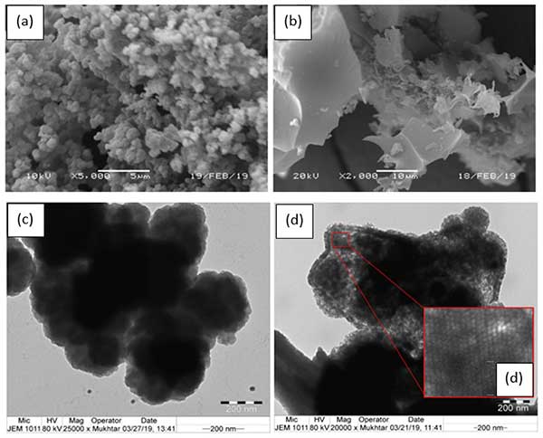 使用SEM,TEM,TGA和XRD分析活性炭的表面形態(tài),熱性質(zhì)和結(jié)晶度。用作活性炭前體的圖像(圖1a,c)顯示其典型的形態(tài)為花椰菜樣結(jié)構(gòu),這種形態(tài)似乎是由于與其中摻雜地嵌入無(wú)序聚合鏈形成的。然而,聚吡咯的球形結(jié)構(gòu)通過(guò)碳化過(guò)程被破壞,導(dǎo)致粗糙,粗糙的表面由不規(guī)則的尖角和剝離狀顆粒組成,在SEM圖像中幾乎沒(méi)有孔隙的跡象;钚蕴烤圻量┑腡EM圖像如圖1d所示表示觀察到均勻分布的微孔。此外,TEM圖像描繪了高度豐富和對(duì)稱的孔隙,表面積和微孔率的值對(duì)應(yīng)于該活性炭。發(fā)現(xiàn)隨著活化劑用量的增加,表面積增加,孔隙率增加。