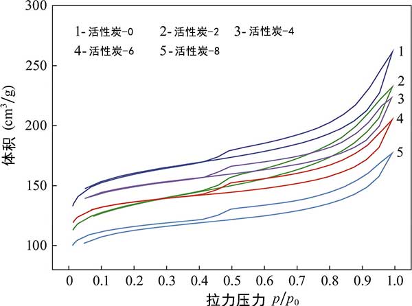 氮等溫線:圖2顯示了活性炭的氮吸附-解吸等溫線。可以看出,根據(jù)IUPAC分類,所有活性炭的等溫線屬于具有磁滯回線的Ⅳ型等溫線,表明活性炭具有中孔。隨著四氧化三鐵添加量的增加,活性炭的等溫線低于載鐵活性炭的等溫線,表明比表面積減小,孔隙增大。