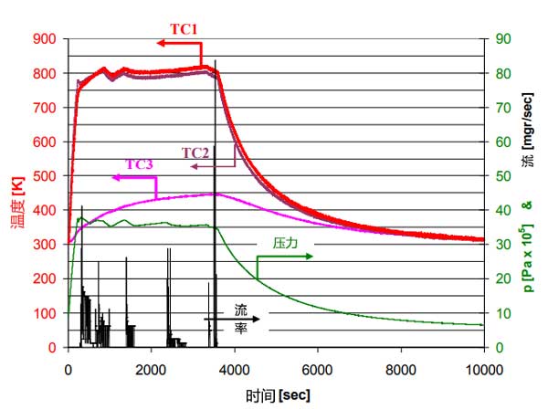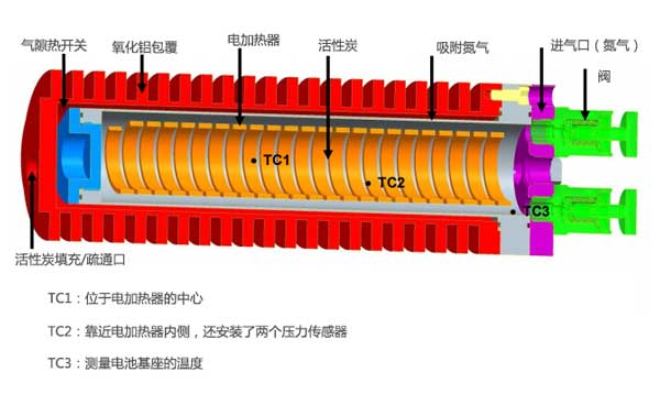 排出壓力約為3.5MPa的實(shí)驗(yàn)結(jié)果如圖4所示。250秒后,加熱功率為500W,中心溫度超過476℃,而電池底座溫度則為76℃。然而,將電池達(dá)到其穩(wěn)態(tài)溫度分布需要大約60分鐘,其中電池基座中的溫度為166℃;钚蕴康臏囟炔辉试S超過526℃。 60分鐘,加熱功率逐漸降低,以保持最高溫度低于526℃,壓力高于3.5MPa。由于電池基座的溫升速率隨時(shí)間降低,輸送的氮量也減少了。因此,在15分鐘后結(jié)束放電階段僅從活性炭吸附池釋放4.6g氮。圖4中的冷卻階段持續(xù)約100分鐘,并且如果放電階段在15分鐘后結(jié)束(此時(shí)基礎(chǔ)溫度僅為126℃),則可以減少冷卻階段。活性炭中的加熱和冷卻速率以及溫度分布與數(shù)值分析估計(jì)的相似。這表明簡化的數(shù)值傳熱分析為吸附池中的傳熱提供了令人滿意的估計(jì)。