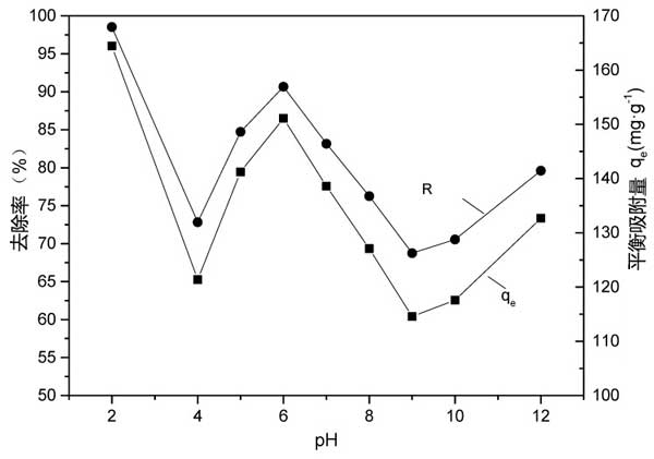 pH對活性炭吸附鉻黑T的影響:用3.00g·L-1活性炭懸浮于含有500mg·L-1鉻黑T的50mL溶液的8個(gè)燒杯中進(jìn)行pH效應(yīng)實(shí)驗(yàn),pH設(shè)定為2.0-12.0。將混合物在25℃的溫度下在振蕩器上平衡48小時(shí)。吸附后,用孔徑為0.45μm的聚醚砜膜過濾混合物,測定鉻黑T水溶液濃度。根據(jù)結(jié)果,我們確定了合適的pH值。