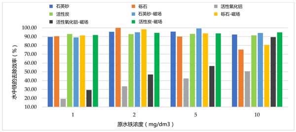 從水中除去鐵和錳可以通過許多常規(guī)方法進(jìn)行。通常,除鐵的本質(zhì)是Fe(II)離子氧化成Fe(III)并通過沉降和過濾從處理過的水中除去沉淀的Fe(OH)3沉積物。然而,脫錳包括將Mn(II)離子氧化成Mn(IV)和以MnO 2沉積物形式沉淀。用于從水中除去這些金屬的方法由它們在處理過的水中發(fā)生的形式?jīng)Q定。我們在水過濾和從水中去除鐵和錳的實(shí)驗(yàn)方面有經(jīng)驗(yàn),并且已經(jīng)開展了一種新工藝的研究,該工藝可以通過傳統(tǒng)方法提高鐵和錳的去除效率。因此,進(jìn)行測試以確定磁場對活性炭的過濾過程的影響。水磁化實(shí)驗(yàn)的目標(biāo)不是鐵還是錳氧化,影響的是水分子的排序。首先測試活性炭和其他吸附劑單獨(dú)對樣品水的過濾情況,發(fā)現(xiàn)僅在通過活性炭過濾的樣品的情況下,樣品中的鐵濃度至磁化低于對照樣品。在該床中除鐵的計(jì)算效率在對照樣品中約為83%,在磁化樣品中為93%(圖2)。在活性炭過濾過程中,鐵去除效率的差異計(jì)算為約3%,有利于用磁化處理的樣品。