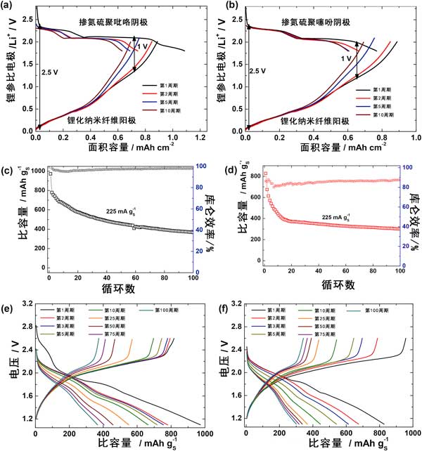 為了證明設(shè)計單個電極的可行性和相關(guān)性,用鋰化硅/納米纖維陽極代替金屬鋰以實現(xiàn)0.鋰-硅/硫全電池。為此目的,陰極和陽極都應(yīng)在半電池測試中實際實現(xiàn)的面積容量方面進(jìn)行平衡。在全電池配置中,硅陽極的脫鋰與硫陰極的鋰化密切相關(guān)。換句話說,硫陰極的放電將遵循硅陽極脫鋰的潛在和容量分布。