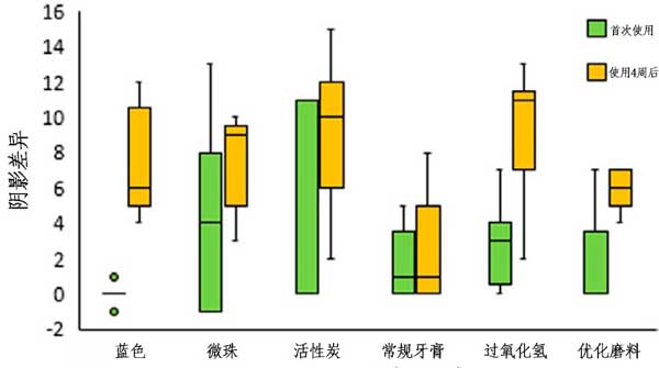 圖2中突出顯示了每次美白性能的統(tǒng)計(jì)學(xué)顯著性差異。由于對(duì)所有美白牙膏的連續(xù)使用,重復(fù)測(cè)量威爾科克森測(cè)試顯示白化的統(tǒng)計(jì)學(xué)顯著增加。然而,對(duì)照牙膏沒有顯示出明顯的增白變化。活性炭的增白效果基于其在口腔中吸附和保留發(fā)色團(tuán)的高容量。活性炭是高度多孔的并且具有極高的表面積, 和比較擅長(zhǎng)去除色素導(dǎo)致牙列的有效和逐步清潔。