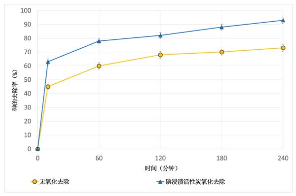 圖4:使用或不使用碘浸漬活性炭時(shí),鐵浸漬活性炭上砷吸附動力學(xué)的比較。