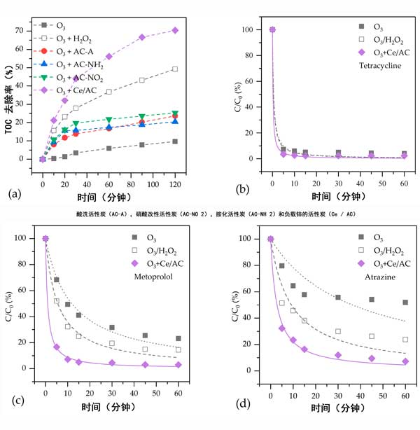 四種活性炭催化劑,例如酸洗活性炭,硝酸改性活性炭,胺化活性炭和通過(guò)改性和浸漬制備的載鈰活性炭。硝化和胺化分別提高了表面酸和堿性官能團(tuán)的濃度,可以在一定程度上提高活性炭的活性。由于吸附,臭氧化和自由基氧化,在活性炭上負(fù)載鈰可以顯著增強(qiáng)活性炭催化臭氧化過(guò)程中水中有機(jī)化合物的去除。載鈰活性炭在水中對(duì)反滲透濃縮液催化臭氧氧化和有機(jī)化合物礦化方面非;钴S。它可以極大地刺激·OH的生成,這對(duì)于去除水中的難降解有機(jī)化合物起著重要作用;钚蕴勘砻娴墓倌軋F(tuán)有助于生成·OH。此外,Ce 3+的氧化還原循環(huán)的組合Ce 4+和富電子結(jié)構(gòu)與氧化鈰之間的電子轉(zhuǎn)移對(duì)于在載鈰活性炭表面快速連續(xù)地生成·OH非常有效。由于這些優(yōu)點(diǎn),載鈰活性炭是催化臭氧化的有前途的催化劑。