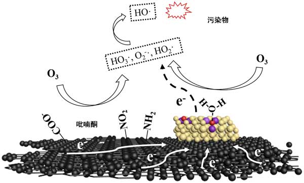負(fù)載鈰的活性炭在臭氧氧化中可以很好的去除有機(jī)物,這主要是由于其各種去除機(jī)理,包括吸附,臭氧氧化和自由基氧化。吸附和臭氧化都是選擇性的。一些有機(jī)物在活性炭上緩慢吸附,因此非選擇性的羥基自由基氧化對(duì)于通過(guò)負(fù)載鈰的活性炭催化的臭氧氧化作用從水中去除難處理的有機(jī)化合物起著重要的作用。催化臭氧化系統(tǒng)中生成·OH的可能機(jī)理如圖3所示。通過(guò)這種機(jī)制,不僅可以通過(guò)表面官能團(tuán)而且可以通過(guò)負(fù)載在活性炭上的鈰來(lái)刺激·OH的生成。由表面基團(tuán)的自由基激發(fā)依靠其堿度和給電子效應(yīng)。對(duì)于負(fù)載在活性炭上的鈰,氧化鈰表面的氧空位是催化活性位。ø 3可以具有氧空位或直接用H反應(yīng)2 ö將其吸附在氧空位,以產(chǎn)生HO 3·,·O2 2-,HO 2·等自由基。這些自由基可以通過(guò)一系列鏈反應(yīng)轉(zhuǎn)化為·OH。在自由基生成過(guò)程中,氧空位周?chē)腃e 3+會(huì)失去電子,并被氧化為Ce 4+,這可能導(dǎo)致催化活性降低。因此,富電子結(jié)構(gòu)(例如石墨烯層,-NO 2和吡喃酮)與氧化鈰之間可能發(fā)生電子轉(zhuǎn)移過(guò)程,從而導(dǎo)致Ce 4+的還原和催化活性的更新。這種協(xié)同效應(yīng)可能是在負(fù)載鈰的活性炭表面快速連續(xù)產(chǎn)生·OH的關(guān)鍵。