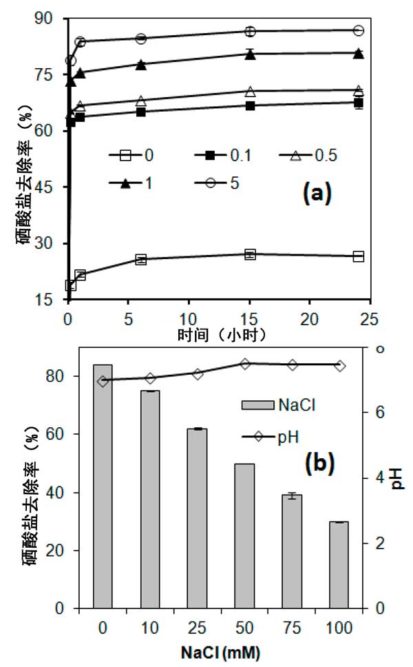 圖2:(a)銅涂層劑量[0,0.1、0.5、1.0和5.0 mmol 的載銅活性炭]對硒酸鹽吸附的影響,(b)溶液對硒酸根在銅包被的活性炭上的吸附的離子強(qiáng)度,以及吸附后溶液的pH,初始pH約為7.0。