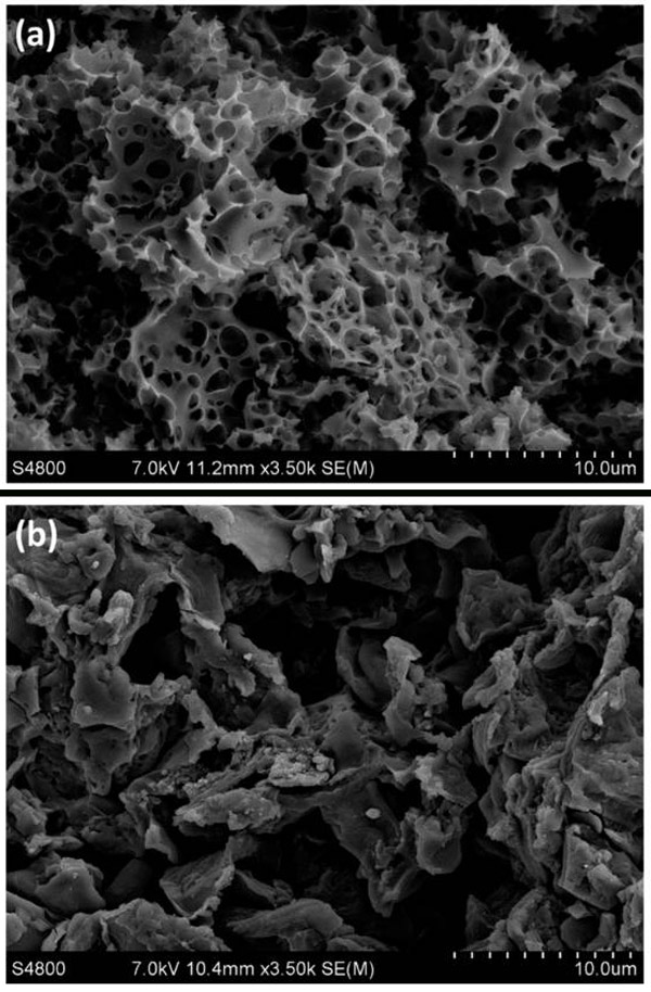 圖1:(a)化學(xué)活化活性炭和(b)物理活化活性炭樣品的SEM顯微照片。